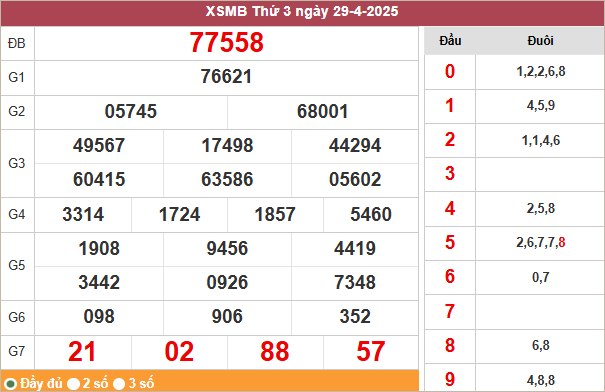 Bảng kết quả miền Bắc ngày 29/4/2025